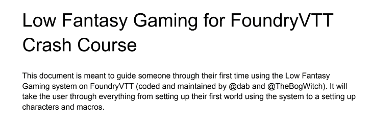 Dread Electromancer Devin Beech has once again gifted us with a Step-By-Step Crash Course for using Foundry with Low Fantasy Gaming – including a list of macros and very handy modules to add to your new set up 😀
