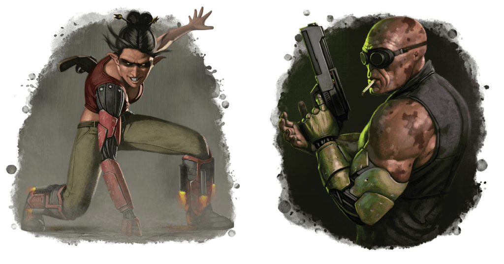 Work continues on Lowlife 2090’s core rulebook. We’re in final editing now, all the art is in, along with the index and OGL. Still on track for an end of April release to Backers, assuming the final proof looks good. Might get pushed back to end of May if it needs further tweaking. In the meantime here’s two of our fav commissions from Dean Spencer! (Spriggan Entech on the left, Skorn merc on the right).