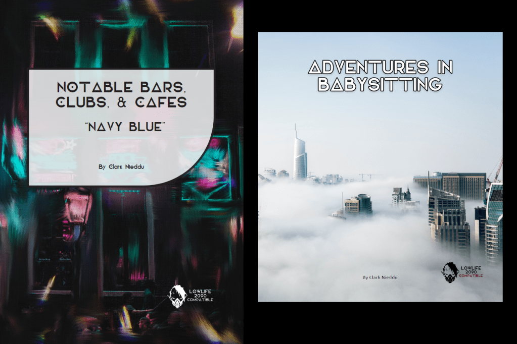 1. Notable Bars, Clubs, & Cafes: Navy Blue: gives Lowlife 2090 players a location in a middle-class district of Mendoza City where players can meet, get jobs, and have fun. It’s intended to help game masters flesh out their own games by doing some of the work for them. This title includes background information on the bar, its owner, and some of its staff. It also includes plot hooks that can be hand chosen or rolled for on a d6. DTRPG LINK
