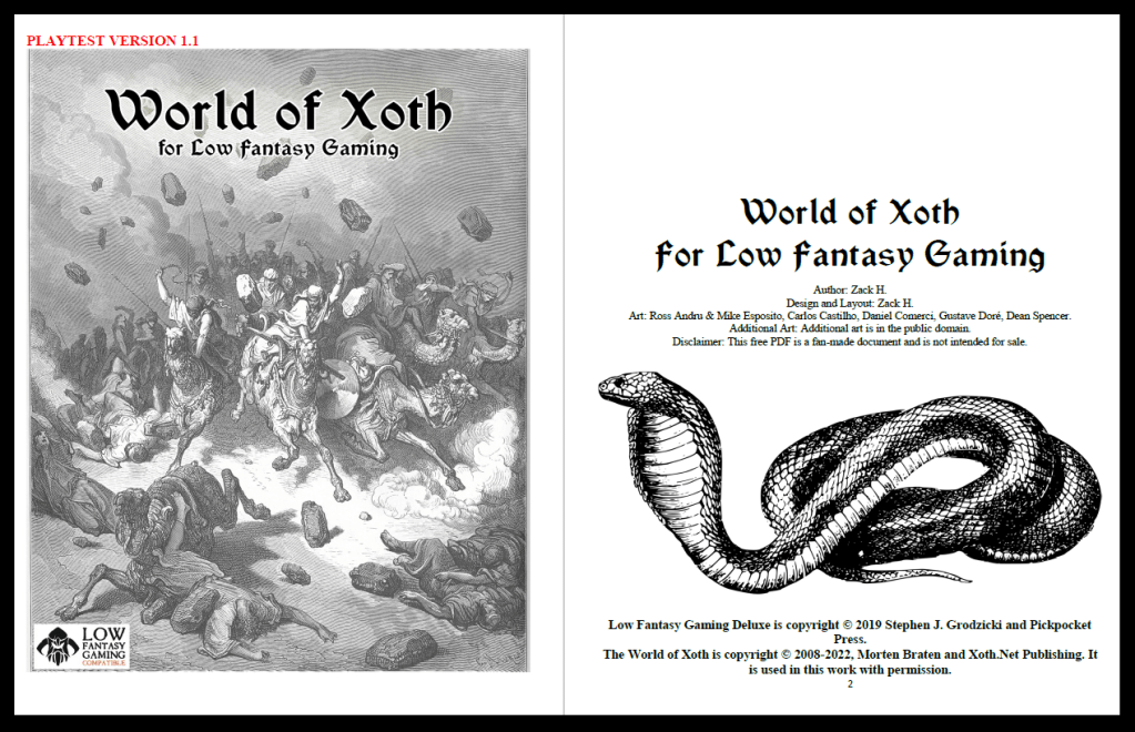 Zack’s free 40 page conversion of the World of Xoth (with Mr Braten’s blessing) is particularly sweet – including cultures, races, three new classes (Conquerer, Courtier, Cultist variant), new gear (weapons, armour, alchemical & herbal concoctions), twelve new spells, thirteen new Unique Features, new monsters, and more cults than you can poke a sacrifice at!! Be sure to check out more of the World of Xoth website here!