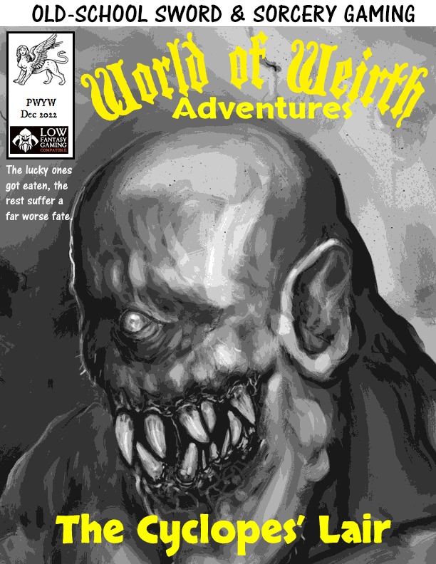 As part of the Dungeon23 project, Stephen Smith has released a four page LFG compatible adventure seed: The Cyclopes’ Lair!